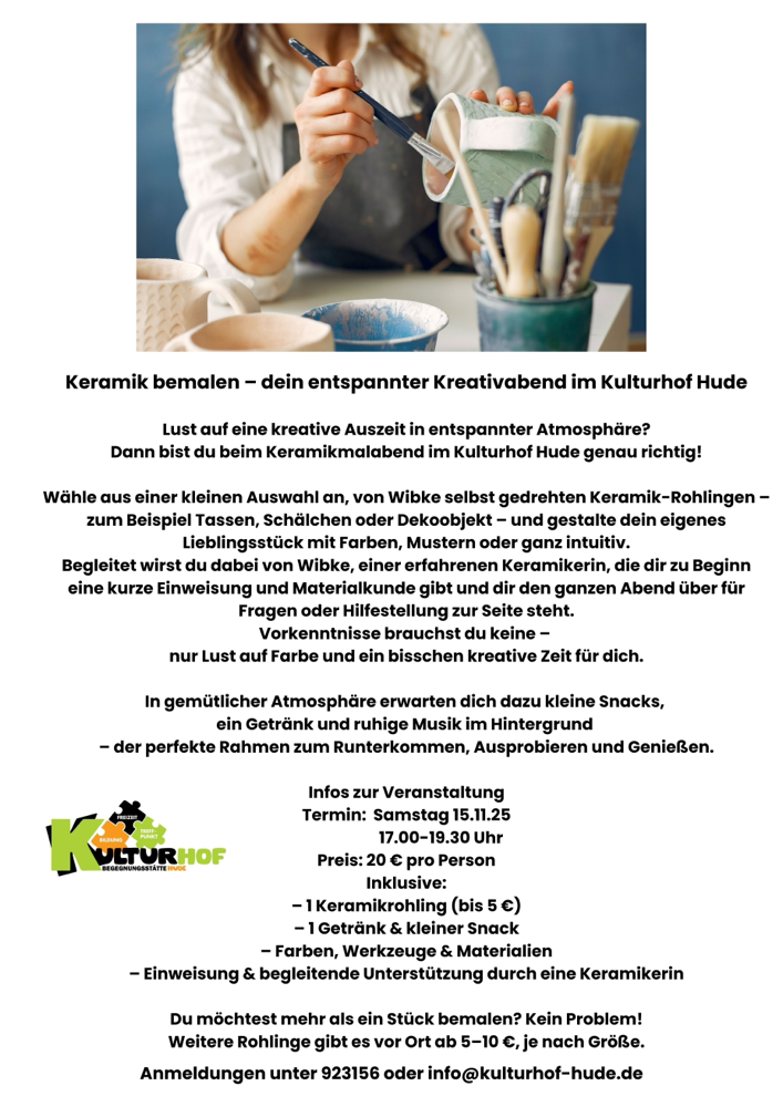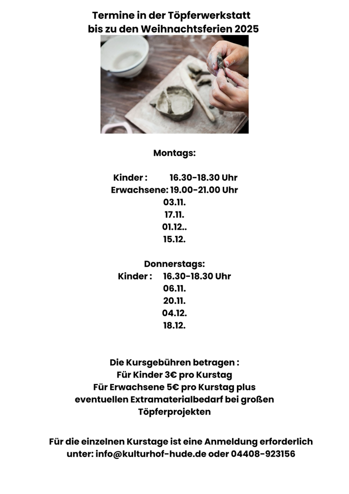 Wir bitten die ehemaligen Teilnehmenden der Töpferwerkstatt ihre Werke bis Ende Januar zu den Öffnungszeiten der Töpferwerkstatt abzuholen.